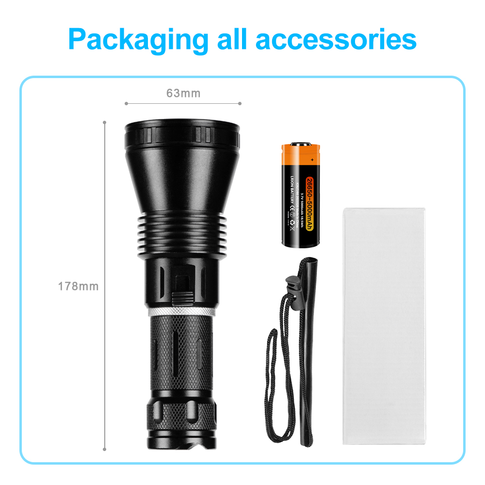 20,000 Lumens High Power Output — driven by a P50 diving LED for maximum underwater brightness