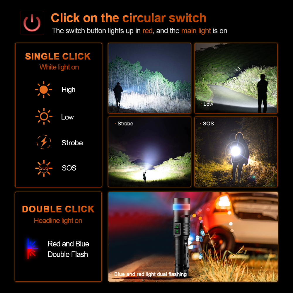 Helius XC511 combines high-powered lighting with built-in safety alerts, making it an essential tool for emergency services, roadside operations, and outdoor professionals. With its 60W white laser, red/blue strobe warning lights, and 4 buzzer modes, this flashlight doubles as a visibility and safety device in critical environments.